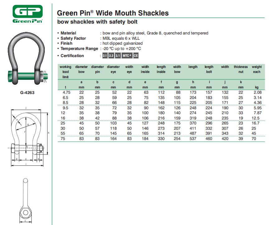 Green Pin BigMouth? 弓形卸扣BN是一種8級卸扣,帶有安全螺栓和更寬的卸扣口。更寬的卸扣口使您能夠將卸扣連接到比普通更寬的連接點(例如墊眼)上。該卸扣還提供雙重安全(開口銷和安全螺栓),防止銷子意外松開。由于Green Pin BigMouth? 弓形卸扣BN的鍍鋅處理,確保了長期的耐用性。當然,Green Pin BigMouth? 弓形卸扣BN符合多種認證。該卸扣適用于單腿和多腿系統,工作負荷限制從4.75到75噸。