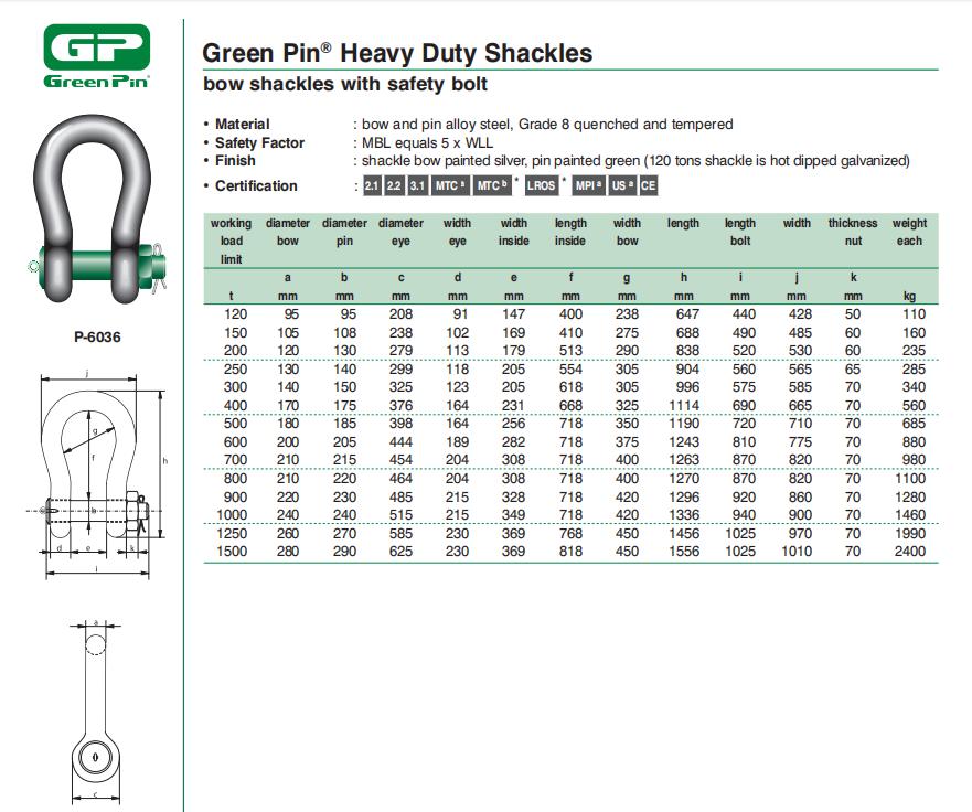 The Green Pin?重型弓形扣BN是一種具有安全螺栓的高負(fù)荷弓形扣。The Green Pin?重型弓形扣BN是重型吊裝項(xiàng)目的好選擇,適用于單腿和多腿系統(tǒng)。當(dāng)銷軸旋轉(zhuǎn)有風(fēng)險(xiǎn)時(shí),該扣的安全螺栓可防止意外松動(dòng)。產(chǎn)品的另一個(gè)重要特點(diǎn)是The Green Pin?重型弓形扣BN符合廣泛的認(rèn)證要求。例如,150噸及以上的重型扣具有勞氏證明載荷測(cè)試證書。The Green Pin?重型弓形扣BN的工作負(fù)荷限制從120噸到1500噸不等。