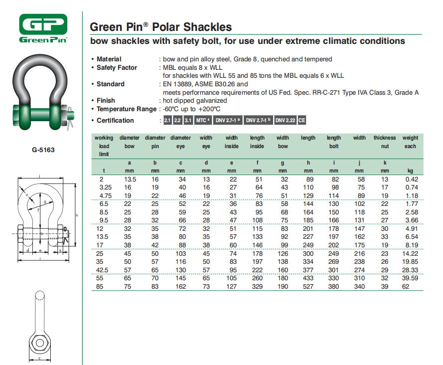 Green Pin Polar® 弓形聯軸器 BN 是一款具有安全螺栓的弓形聯軸器,經過優化可在低溫下使用。該聯軸器可在極端氣候條件下使用,溫度低至-60°C(-76°F)。該聯軸器提供雙重安全保障(分裂銷釘和安全螺栓),防止銷釘意外松動。由于Green Pin Polar® 弓形聯軸器 BN 進行了鍍鋅處理,因此保證了其長期耐用性。當然,Green Pin Polar® 弓形聯軸器 BN 符合DNV GL等船級社的一系列認證要求。Green Pin Polar® 弓形聯軸器 BN 適用于單腿和多腿系統,工作載荷范圍從2噸到85噸。